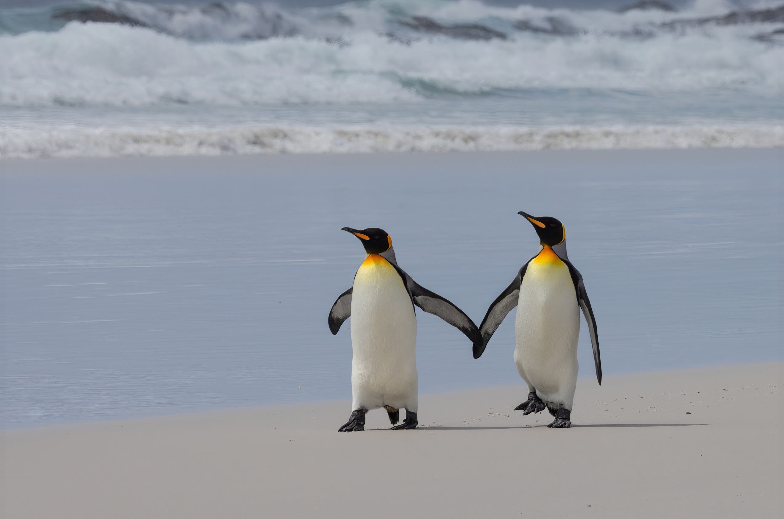 Mine is the photo of the king penguins that I took in the Falkland Islands in South America in 2023.  Of all the birds I photographed, penguins are my favourite, followed by owls.  Their human-like behaviour is both cute and beautiful.  The two king penguins walking along the beach, fin touching fin, were so human-like. One penguin was leading the way while the other looked around as if she needed time to enjoy the beautiful ocean. The male penguin waited patiently for her so they could walk together.  In February 2023, I went on a cruise to visit the Falkland Islands. The cruises before and after us were unable to land due to the weather conditions.  After I returned home, I found out that my friends who were on the cruise behind us one week later were also unable to land. This made me appreciate our luck even more.